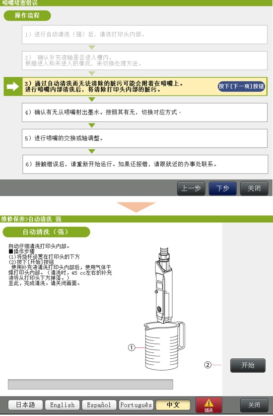 发生错误时,可通过操作面板确认解决方法(作业步骤)。通过问答方式确认机器状况,并同时显示作业步骤,因此无需担心发生错误。即使是初次发生的错误,也无需耗费时间即可顺利切实进行维修。