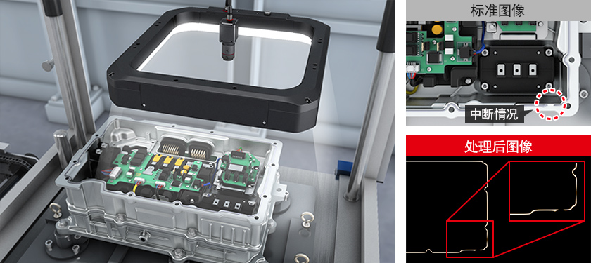 为保持变频器的气密性,检测密封材料的宽度及中断等不良。支持LumiTrax™的400 mm照明,可消除密封材料表面的光晕,防止判断错误。可通过2100万像素在大视野中实现高精度检测。