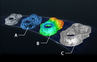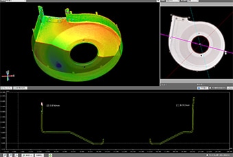 使用VL 系列,通过将三维CAD数据与冲压件进行比较,可以用色谱图将与CAD的差异可视化。