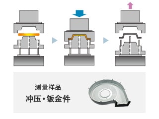 冲压加工是利用塑性变形的一种塑性加工,是将金属等材料压在模具上,通过施加压力使其变形的加工方式。加工种类有“切(剪断加工)”“弯(弯曲加工)”“拉(拉深加工)”,因其加工时间短、成本低,适合大批量生产。此外,冲压加工品由于加工中的应力及摩擦等原因,容易产生厚度误差,因此有时需要在加工后对工件进行厚度测量。