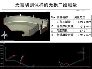 关于厚度的测量,以往通常使用卡规或游标卡尺,但对于复杂形状,有时会存在物理上难以触及的情况。此时只能进行切割测量的破坏性检测,但根据样品的不同,切割本身也可能导致其变形,从而影响测量值。