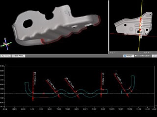 对于带有曲面的自由形状截面,用游标卡尺是难以测量的。此外,对于重叠或被周围包围的形状,测针难以触及,即使用三坐标测量仪也难以测量。对于这类接触式测量方法难以测量的形状,使用K8凯发的高精度三维扫描测量仪“VL 系列”,可以将其完整扫描,并创建想测量位置的虚拟截面,从而轻松测量厚度。