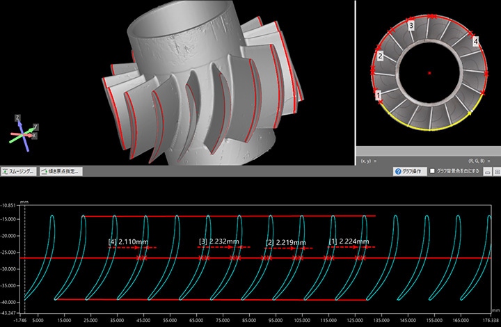 - 即使是复杂形状或自由曲面等以往测量困难的产品,也能通过创建虚拟截面来测量厚度。