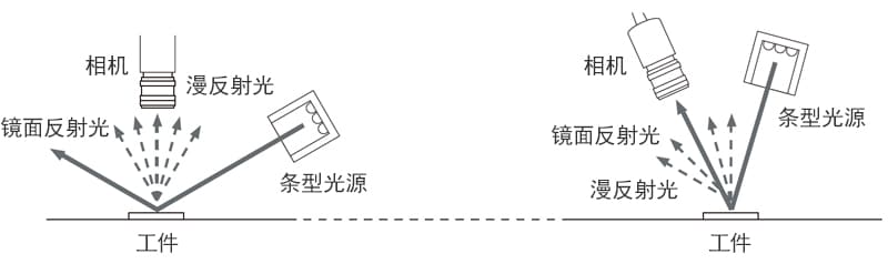 条型光源可对长尺区域进行均匀照射。可安装为斜向照射,以漫反射光进行拍摄、辨别,从而避免产生引起光晕的镜面反射光。此外,还可将相机与照明呈相同角度倾斜,以获取镜面反射光,从而突显出刻印等的边缘成分。而且光泽较强时,也可使用偏光镜来达到效果。