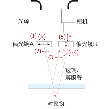 (1) 的光是使用偏光镜 A 偏向 (2) 方向的光。薄膜面(镜面反射)会直接反射,(3) 的光会被偏光镜 B 遮断。但是,由对象物表面(漫反射)反射的光,会再次扩散成为 (4) 的光,仅 (5) 的偏光成分可通过 B 射入相机。