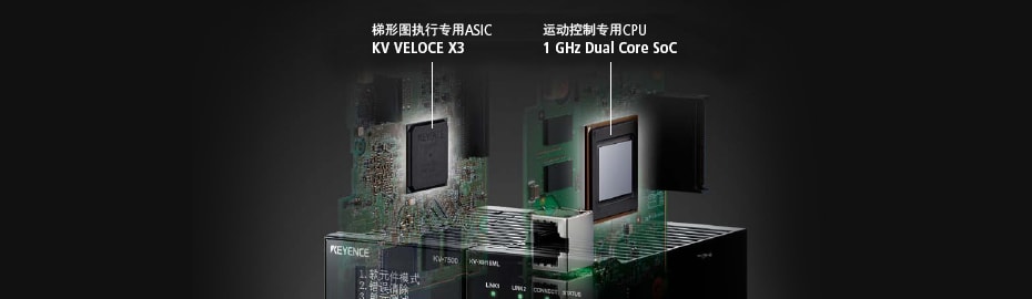 此外,还配备高速通信“MECHATROLINK-III”和高速梯形图执行专用ASIC“KV VELOCE X3”,可实现高速、高精度的运动控制。